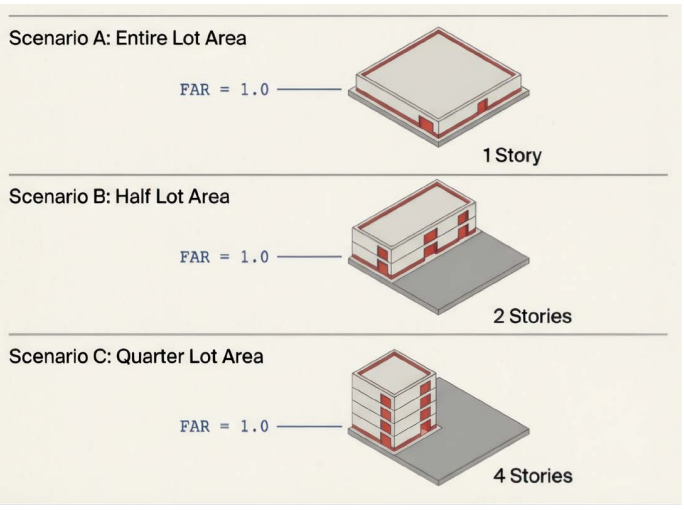 These are essentially a property owner’s development rights or their buildable square footage in relation to their lot coverage. If more of the lot or yard is left open or without a structure, the property owner should, in theory, be allowed to build higher. Figure 1 illustrates the Floor Area Ratio of 1.0 showing lot coverage based on the scenario of a one-story, two-story, and a four-story building. A one-story 1,500 square foot starter home on a 10,000 square foot lot would be 1,500/10,000 = 0.15 FAR. Anything over FAR of one means there will be multiple stories to the structure.