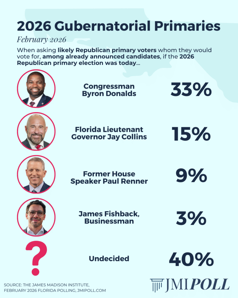 Republican Byron Donalds is maintaining a lead in the gubernatorial race, bolstered by support from President Trump. In the Republican primary (among likely Republican voters): Byron Donalds holds 33%, Jay Collins 15%, Paul Renner 9%, James Fishback 3%, and 40% undecided.