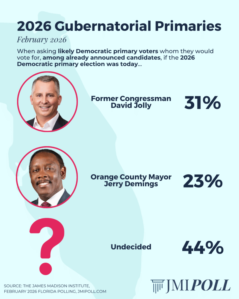 In a matchup for the Democratic nomination for governor, former Congressman David Jolly received 31% support, Orange County Mayor Jerry Demings 23%, 2% indicated they would not vote, and 44% were unsure.