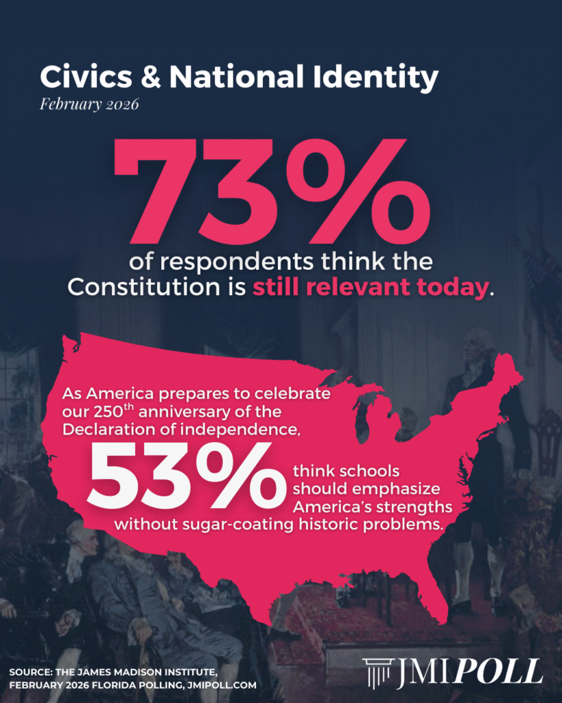 “With America approaching its 250th anniversary, Floridians are demonstrating that patriotism and pragmatism go hand in hand. They overwhelmingly affirm the Constitution’s enduring importance, yet they are clear-eyed about the economic challenges facing their families. As the State of the Union conversation highlights national resilience, our findings show voters want that resilience reflected in policies that rein in property taxes, strengthen energy reliability, and expand educational opportunity across Florida.” — Dr. Bob McClure, President and CEO, The James Madison Institute